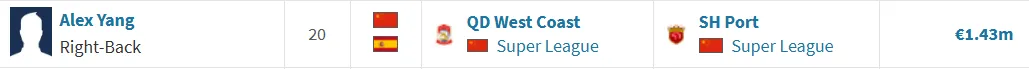 虎扑02月06日讯 据《转会市场》更新,U23国脚边后卫杨希加盟上海海港的转会费为143万欧元(约合人民币1168万元)。